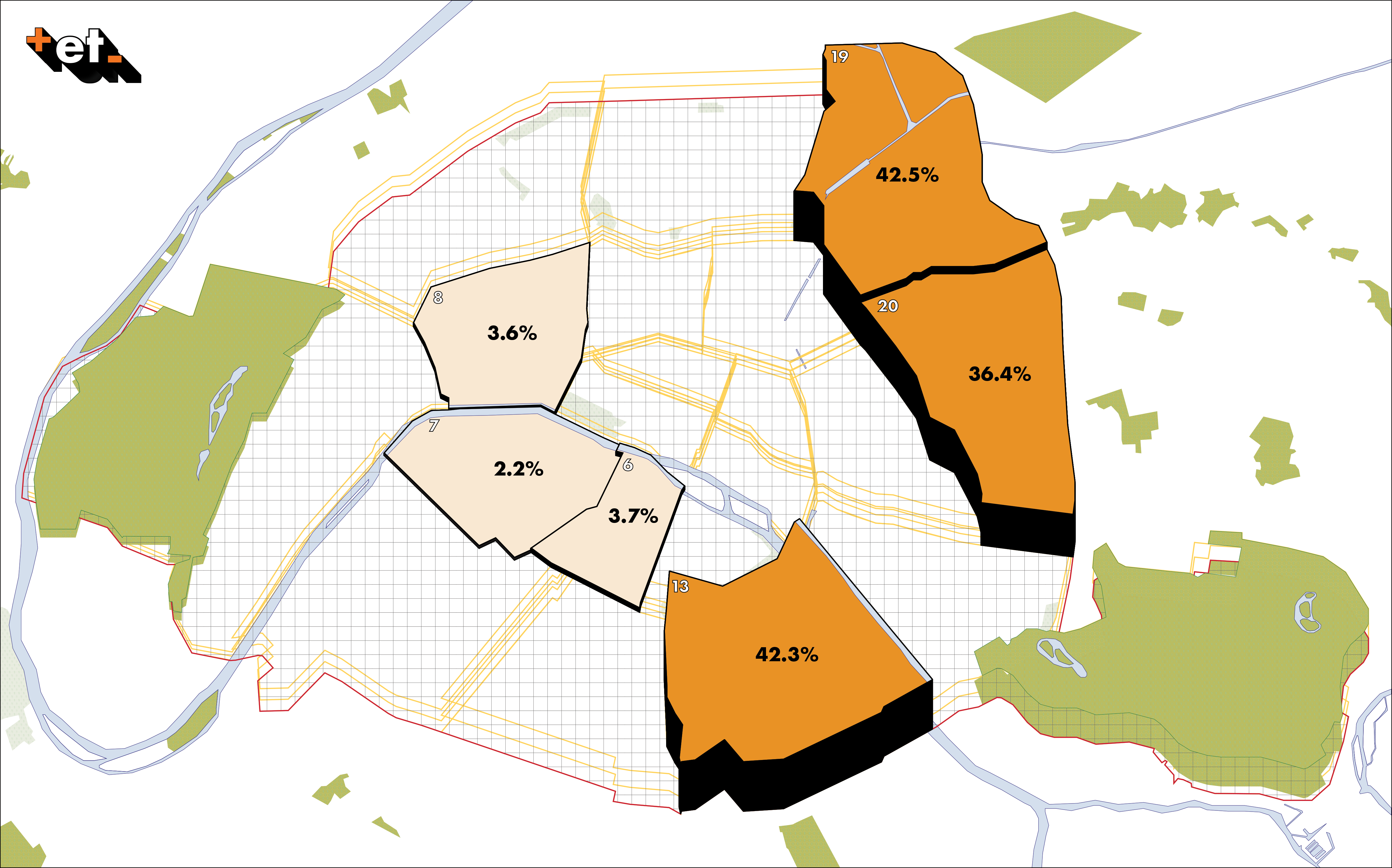 en. Percentage based chronopleth map of amount of social housing per arrondissement in the French captial, Paris.